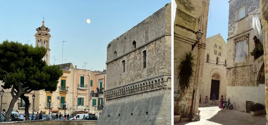 E’ come dire Città Alta. Ci arriviamo dal porto, alle spalle del Castello Svevo che ci sorveglia arcigno. La luna sbarazzina occhieggia sopra le sue mura. “Ci prendiamo un panino da ’u Russ, il Rosso”, suggerisce il compagno di mia nipote, “pane di semola con salsiccia, pomodorini e una foglia d’insalata”. Ad un tavolino si siede, una volta servito, un atletico giovane che appoggia lo zaino ben carico e il nodoso bastone del pellegrino che segue antichi percorsi. Appartata, la Chiesa di Santa Chiara un tempo sede degli Ordini cavallereschi.