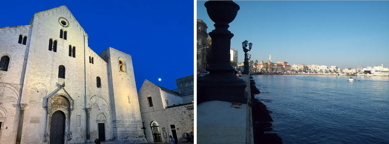 Dalla Muraglia vediamo sul lungomare gente seduta a godere meglio la frescura del mare. Incontriamo gli altri baresi della Città murattiana, dell’estramurale, dei quartieri periferici, coppie, famiglie, single, torme di giovani, il popolo della notte che qui viene a far festa. Li troviamo in paziente attesa per un gelato, le focaccine, i panzerotti, i maritozzi, le frittole, le sfoglie, i panini ripieni, la granita. L’acqua riverbera il luccichio del lungomare, benemerita opera completata in età fascista, da Punta Perotti al Teatro Margherita.