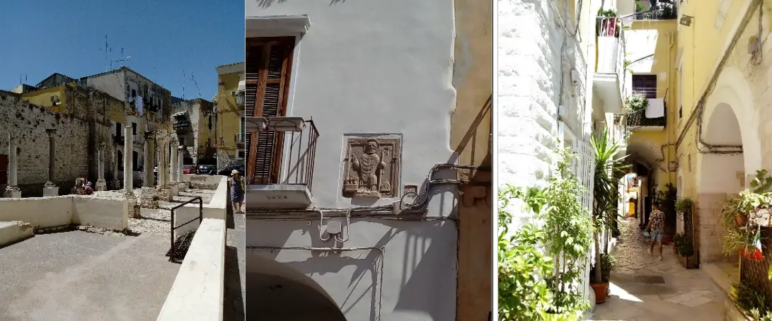Per strada a Bari Vecchia c’è gente a tavola, donne a servire la pasta nello spazio delimitato da piante di gelsomino o edera, tra le campanelle della dipladenia o le erbe profumate. Nelle vicinanze del Convento di Santa Scolastica, oggi Museo Archeologico, rivedo la minuta signora sulla seggiola che mi parlava di soldati o profughi qui raccolti durante la Seconda Guerra. ”Ci sono anziani che vivono ai piani alti e da quelle ripide scale non scendono più”. Ragazzine a gruppetti si spostano tra vicoli in concitate confidenze e pronte a girarsi al passaggio di qualche ragazzotto in motocicletta o sul monopattino elettrico.