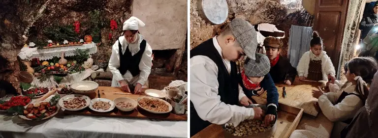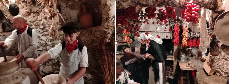 Ci viene incontro un ragazzotto con un gran cesto di varietà di verdure e lo mette all’incanto da abile banditore. Il ragazzino che ha davanti una macina a mano per il grano mi parla di grano duro e tenero, e mi invita a mettere la mano sotto il foro – “provare per credere” – ad annusare la farina di diverso colore, o di grano tenero o di grano duro, più pastosa l’una, più granulosa e digeribile l’altra. Il latufaio spiega come si ricavavano i blocchi di pietra – ognuno non meno di un quintale – dalla lama calcarea, varia di colore e composizione da zona a zona, con gl’incudini ficcati, il lavoro del piccone, la sega per renderlo liscio e adatto alla costruzione, il trasporto di asini e barche. Vecchio e ragazzo costruiscono fiscoli, i dischi di vimini intrecciati da mettere sotto il torchio dove la polpa delle ulive si spreme e fuoriesce il “liquido d’oro” della dea Atena. Nella bottega del farmacista sono esposte erbe ed essenze in quantità, per profumi e farmaci di benessere. Le signore stanno chine sui centrini, concentrate, impegnate, silenziose a far passare l’ago e comporre il disegno floreale. Il pecoraio di 40 pecore, uno degli ultimi due rimasti, mi dice che ne aveva 160, a brucare or qui or là sui prati intorno: “Dopo me più niente. Non c’è nessuno che ci segue.” Un po’ di fatica a capire ed essere capiti per il reciproco italiano imbastardito dai dialetti. Alla fine la Natività, due sorridenti Maria e Giuseppe con il bimbo di otto mesi, proprio il loro, sazio e quieto nelle braccia della madre.