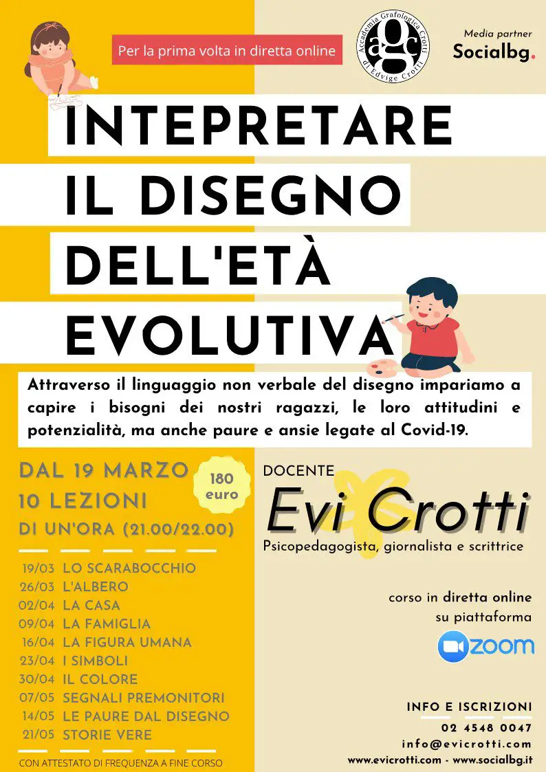 Il corso per capire i nostri figli attraverso il disegno si terrà in diretta online su piattaforma Zoom. Partirà il 19 marzo. 10 lezioni di un’ora (21.00/22.00) a cadenza settimanale terminate le quali sarà rilasciato un attestato di frequenza.