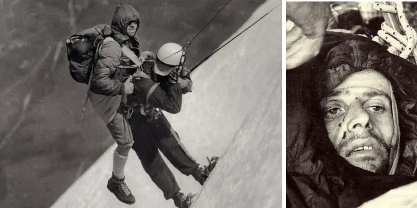 Poco, però. Stava per calare la sera. Avevano bivaccato già sulla cima la notte precedente con un vento che non aveva mai cessato di tormentarli. Troppi uomini impegnati, troppe condizioni avverse, i materiali usati logori. Bisognava rientrare. Claudio ha gli occhi febbrili, il volto sfatto, la bocca piagata. E’ rimasto tanto tempo senza bere e mangiare. Ringrazia, sente il calore di tanta gente intorno. Lo portano in barella. Nella discesa tra il sibilare del vento arrivano le invocazioni di Stefano, rimasto solo inchiodato sulla maledetta parete. “Domaniii!” gli gridano, ma sanno che è impossibile. Solo Claudio Corti è tornato vivo, dopo nove giorni, dall’inferno dell’Eiger. Per lui fanno festa con il rammarico per chi non ce l’ha fatta.