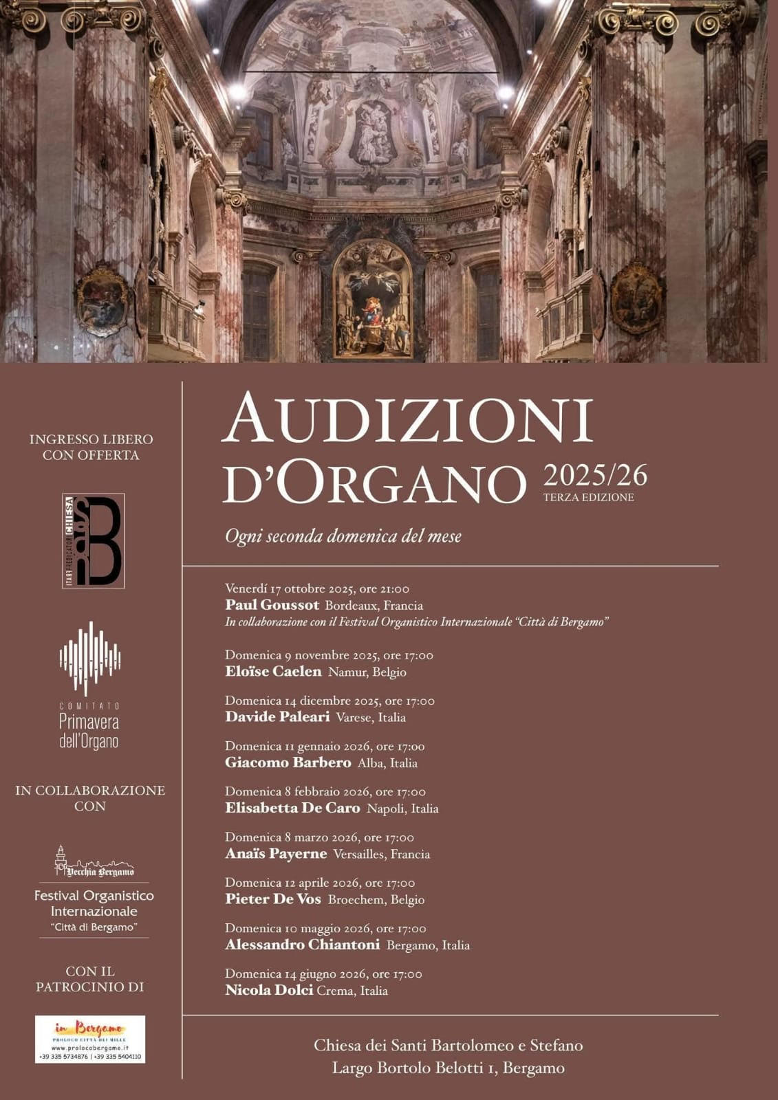 Dopo il riscontro ottenuto nei primi due incontri — che hanno visto protagonisti il francese Paul Goussot, in collaborazione con il Festival Organistico Internazionale “Città di Bergamo”, e la belga Eloïse Caelen — la rassegna prosegue con un programma pensato per esaltare le magnifiche sonorità dell’organo di San Bartolomeo, considerato un vero gioiello cittadino di straordinario valore storico e musicale.