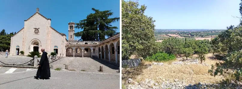 Arriviamo da Bari passando per Gioia del Colle con sosta al Santuario della Madonna della scala. Immagino alludi alla scala del Cielo. Su un’altura, un viale alberato e un grande parcheggio. La chiesa e il monastero, i benedettini dal saio nero qui giunti da Parma nel 1930 quando esisteva solo una chiesetta. Visitabile solo dalla grande chiesa dove sta per iniziare la messa prefestiva. “Cantata in gregoriano” mi dice la signora che sta uscendo dalla foresteria. Divenne monastero, un punto di riferimento e di spiritualità per tutta la Regione, i monaci dediti anche al restauro di libri antichi. Il luogo fu trasformato in seguito al lascito di Donna Laura Lenti, l’ultima erede di una illustre famiglia del posto, con campi e coltivazioni circostanti.