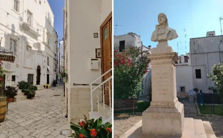 Si passa davanti al Palazzo Comunale con l’adiacente statua dell’illustre concittadino Giuseppe Albanese, martire della Rivoluzione napoletana del 1799. Fu uno dei capi di quella breve repubblica, dopo la cacciata dei Borboni. Giuseppe apparteneva ad un nobile casato che aveva fatto la storia di Noci. Lui contribuì a quella napoletana, alla prima rivoluzione borghese d’Italia, cinquant’anni prima di Milano. Gli eventi furono favoriti dai francesi padroni della penisola ma che poi fecero di tutto con il loro comportamento (e latrocinio) per far andar male le cose a Napoli. La città era la più grande d’Europa, con una costituzione che ricalcava quella francese. Ritiratisi i francesi dopo il fallimento dell’impresa napoleonica in Egitto, i seguaci della Repubblica furono sopraffatti dai sanfedisti del Cardinal Ruffo, i capi decapitati sulla piazza del mercato, tra cui la passionaria Elena Pimental Fonseca, ultima a salire sul patibolo con le parole: “forse un giorno sarà caro ricordare tutto questo”.