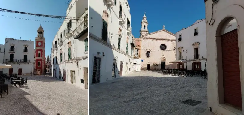 La Torre dell’Orologio è stata ricostruita sulla vecchia dopo le intemperie del marzo 1900, funzionante, con le due campane e i rintocchi, per l’ora e la mezza. Si è già in Piazza Plebiscito, luogo storico della vita politica. La Chiesa della Natività di Maria, recentemente restaurata, rivela dei tesori scultorei notevoli: la Madonna in trono col bambino di Stefano da Putignano (1509), il fonte battesimale di pietra locale, il polittico dietro l’altare maggiore.