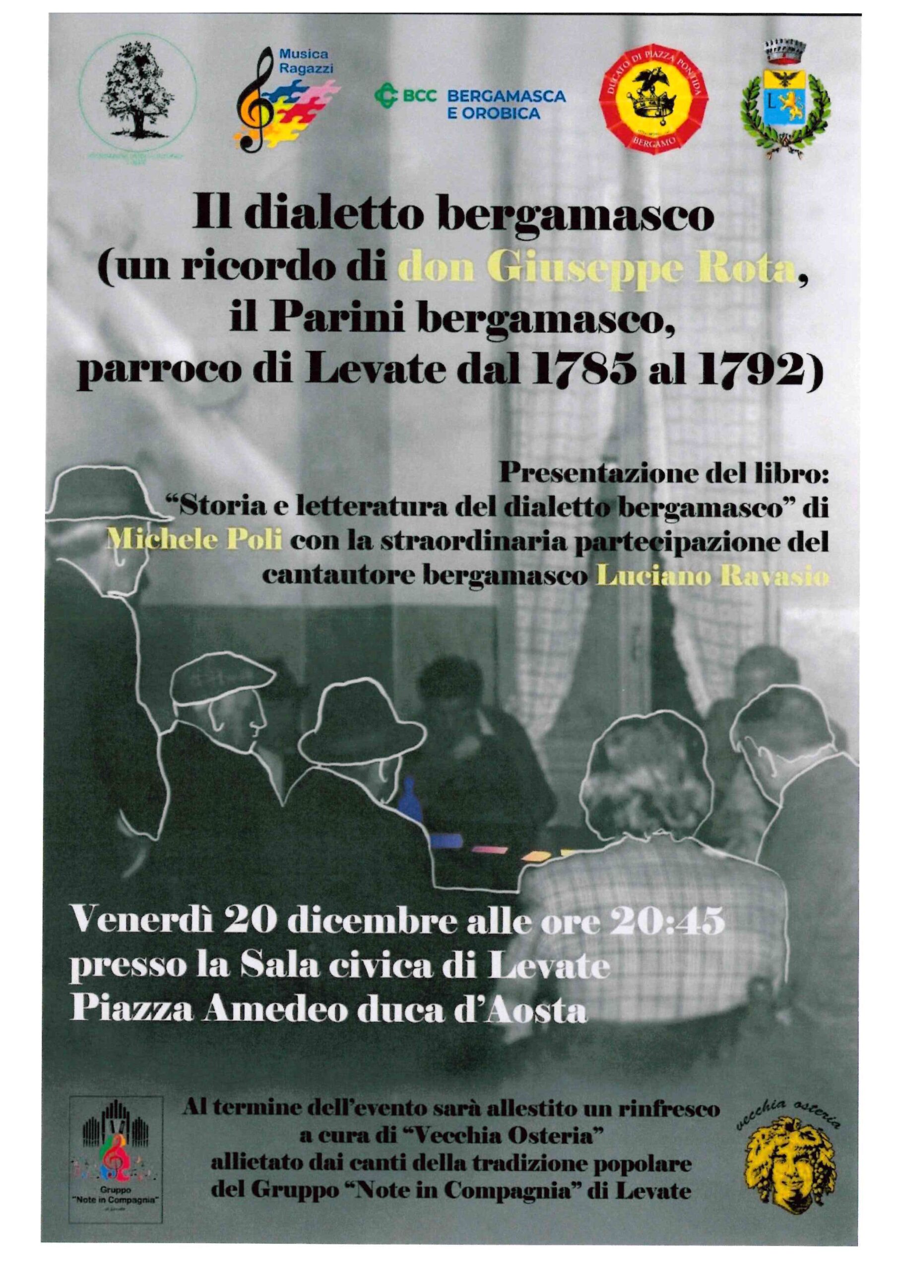L’Associazione Civica e Culturale “L’Olmo” di Levate propone una conferenza dedicata al dialetto bergamasco a cura di Michele Poli (classe 1993). L’iniziativa dal titolo “Il dialetto bergamasco (un ricordo di don Giuseppe Rota, il Parini bergamasco, parroco di Levate dal 1785 al 1792)” è venerdì 20 dicembre 2024 nella Sala civica di Levate. Si tratta di un appuntamento organizzato la collaborazione con l’Associazione “Musica Ragazzi A.P.S.” di Osio Sopra, con il patrocinio con contributo della “Banca di Credito Cooperativo Bergamasca e Orobica”, nonché con il patrocinio gratuito del Comune di Levate e del Ducato di Piazza Pontida.