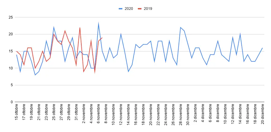 Andamento necrologie dal 15 ottobre 2020 con il confronto all’anno precedente.