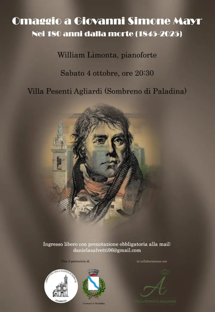 Sabato 4 ottobre alle ore 20:30 Villa Pesenti Agliardi di Sombreno (Paladina) aprirà le sue porte per un appuntamento musicale di grande valore culturale: un concerto dedicato a Giovanni Simone Mayr (1763-1845), in occasione dei 180 anni dalla sua scomparsa. L’evento, a ingresso libero con prenotazione obbligatoria ([email protected]), gode del patrocinio del Comune di Paladina e della Parrocchia di Sombreno, in collaborazione con Villa Pesenti Agliardi.
